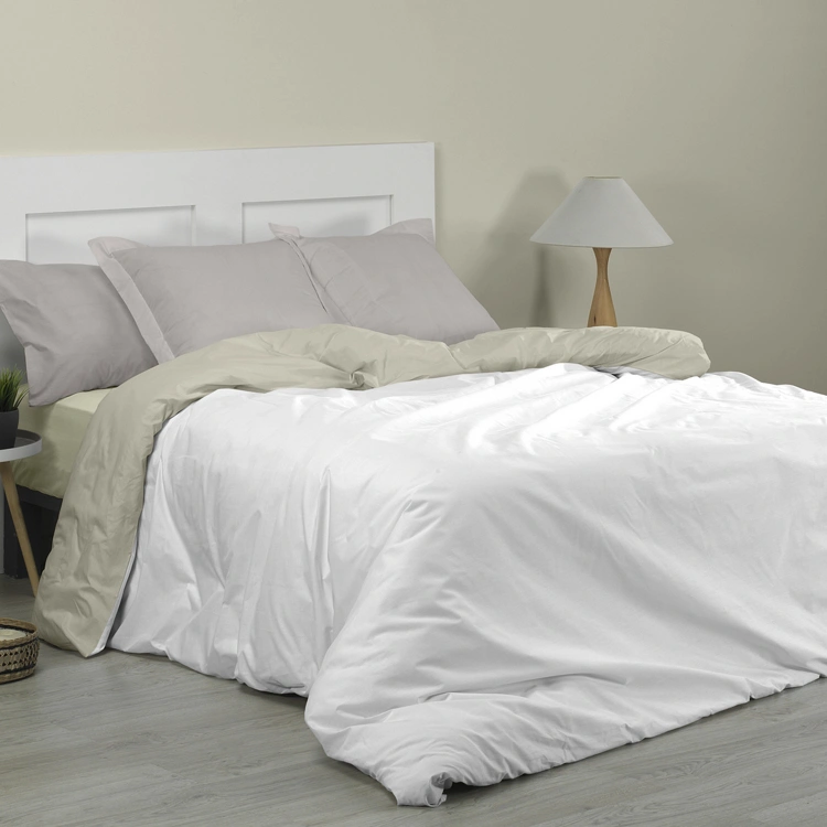 Funda Nórdica Bicolorblanco/piedra pieza única. Composición: Tejido 50% algodón 50% poliéster de 115 gr/m2. La combinación de estos dos tejidos se llevo a cabo debido al problema de algunas personas con el tejido de algodón puro, así como duran más tiempo y al meterlo en la lavadora conserva más el color. Está compuesta por 144 hilos, lo que hace que esta tela proporcione más suavidad, además son las preferidas del mercado debido su durabilidad en el tiempo. Disponible en diferentes colores para poder combinar como quieras tu cama. Elige la medida que más se ajuste a la tuya.